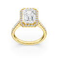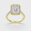 Indulge in pure luxury with this breathtaking 5.5/8 CTW Diamond Bridal Ring, designed to be the ultimate symbol of love and commitment. At its heart lies a stunning 5.00 CTW Emerald-cut center stone, radiating brilliance and fire. Surrounding this magnificent diamond is a delicate halo, enhancing its sparkle while maintaining an elegant and timeless appeal. The simple shank design adds a touch of sophistication, allowing the center stone to take center stage.